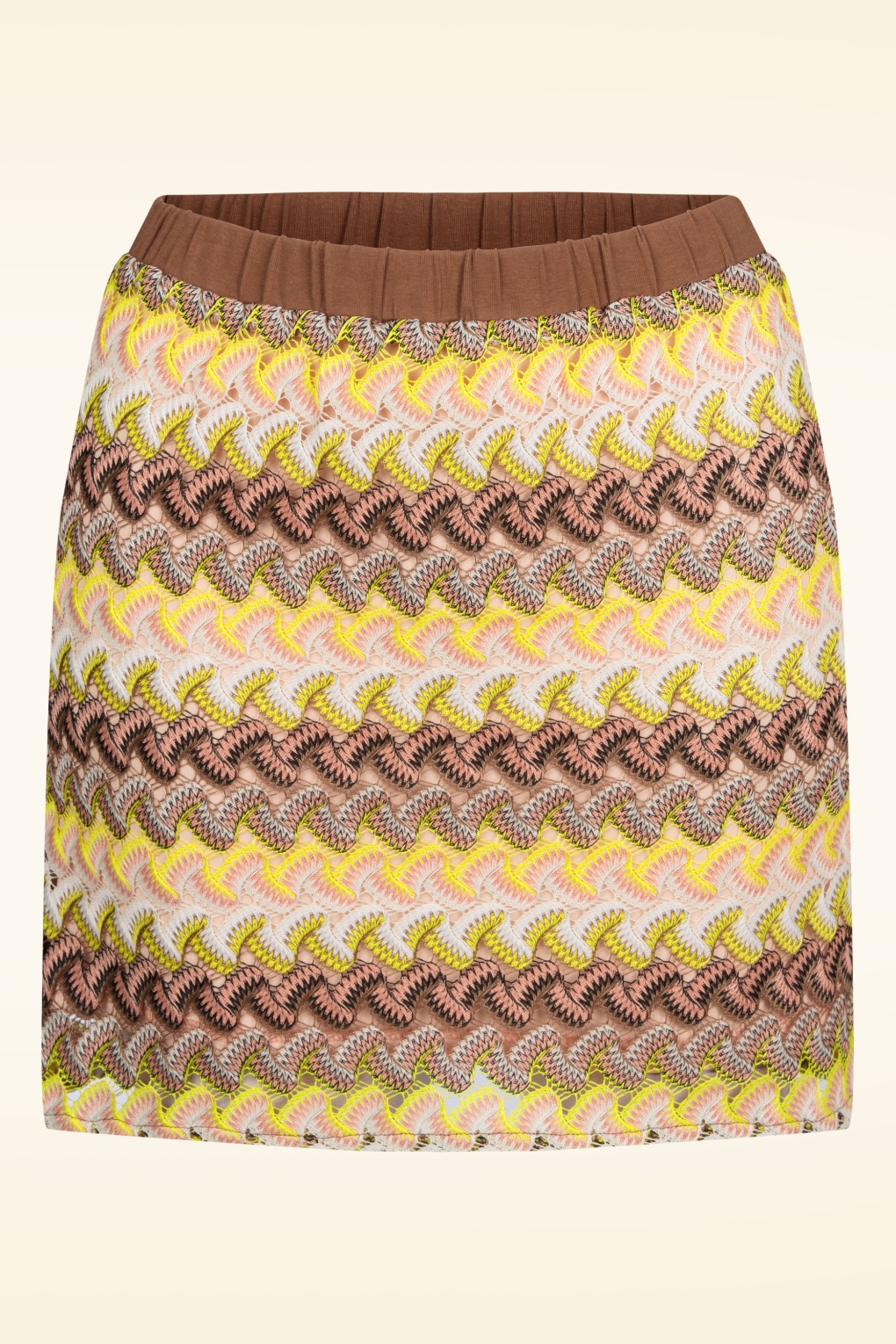 ”Groove is in the heart”… en in dit rokje 😉 Dit iets aansluitende mini rokje is uitgevoerd in een luchtig, opengewerkt stofje met een lichte stretch en een retro zigzag patroon. Voorzien van een onderrokje voor extra comfort en om doorschijnen te voorkomen. * Elastische tailleband * Geen rits of knopen * Voorzien van een onderrokje * Valt bij een lengte van 1,70 m ruim boven de knie * Match met het bijpassende topje voor een complete look!