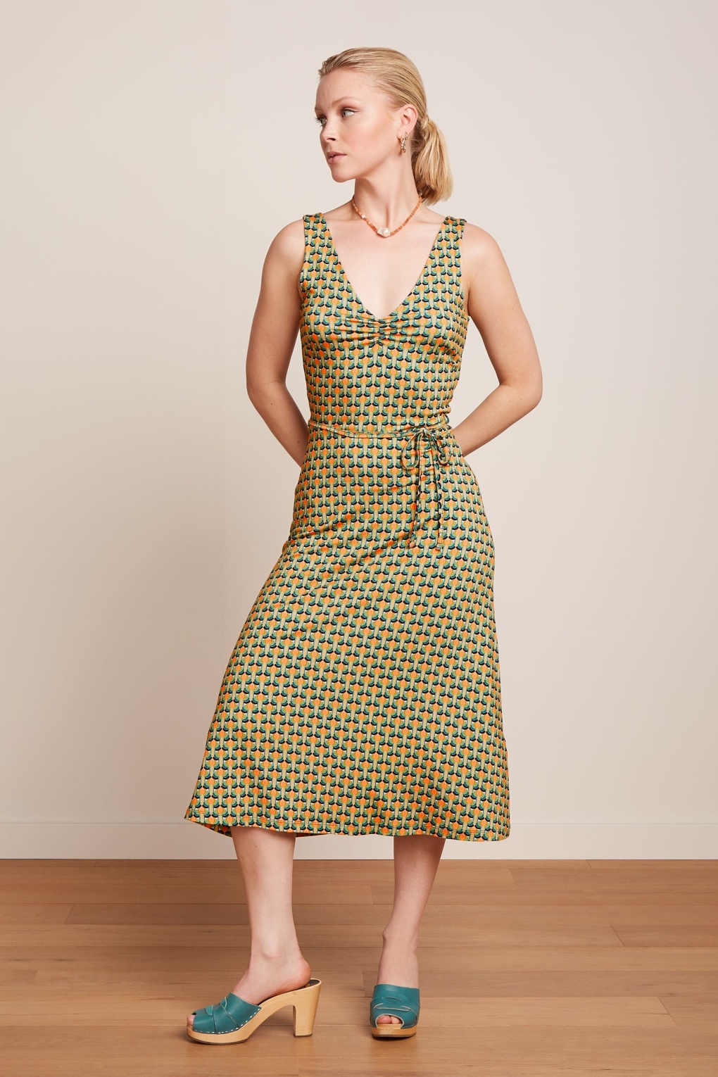 Als je nog geen last had van zomerkriebels, dan krijg je ze wel van deze flowy jurk! Anna accentueert je taille door het smalle, afneembare stoffen striklintje en is uitgevoerd in een soepele en stretchy, EcoVero viscosemix met een grafische print in zalmoranje, groentinten, navy en een vleugje wit. * Gevoerde top * Mouwloos * V-halslijn met plooitjes * V-rug * Afneembaar stoffen striklintje * Geen rits of knopen * Valt bij een lengte van 1,70 m over de knie