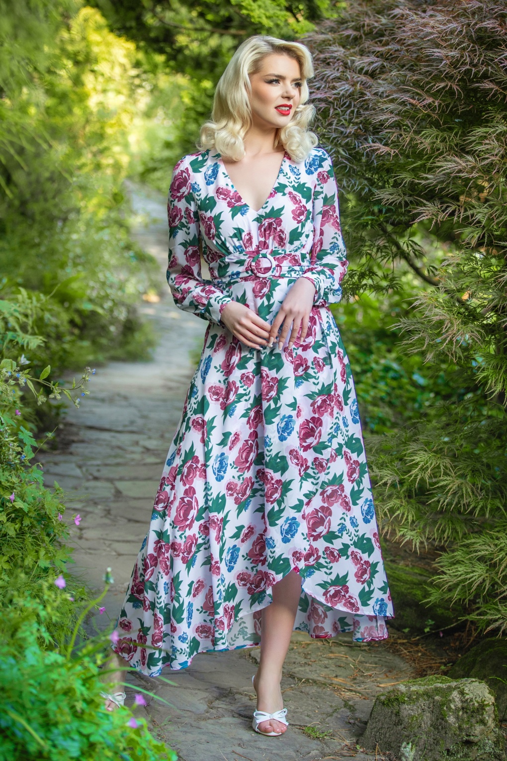 ‘’Travel is the gorgeous feeling of entering the unknown.’’ Dit seizoen hebben onze eigen in-house ontwerpers zich laten inspireren door de wereldse vrouw die straalt, waar ze ook gaat of staat. Straal tot de ‘max’ in deze Annique maxi jurk met wildflower print! Ze heeft een elegante V-halslijn, lange doorschijnende mouwen en een geplooide tailleband vanwaar ze uitloopt in een flowy overslag maxi rok. Ze is uitgevoerd in een soepele en luchtige witte stof (stretcht niet!) voorzien van een bloemenprint in groen, blauw en verschillende roze tinten. * Maxi jurk * Gevoerde top met V-halslijn en plooitjes bij de buste * Bra strap holders zodat je bh bandjes niet gaan schuiven * Lange, licht doorschijnende mouwen met manchetten * Geplooide tailleband met vast riem detail * Gevoerde rok met overslag * Blinde rits in de zijnaad * Gorgeous Rachel is 1,72 m: haar pumps zijn haar eigen vintage treasures