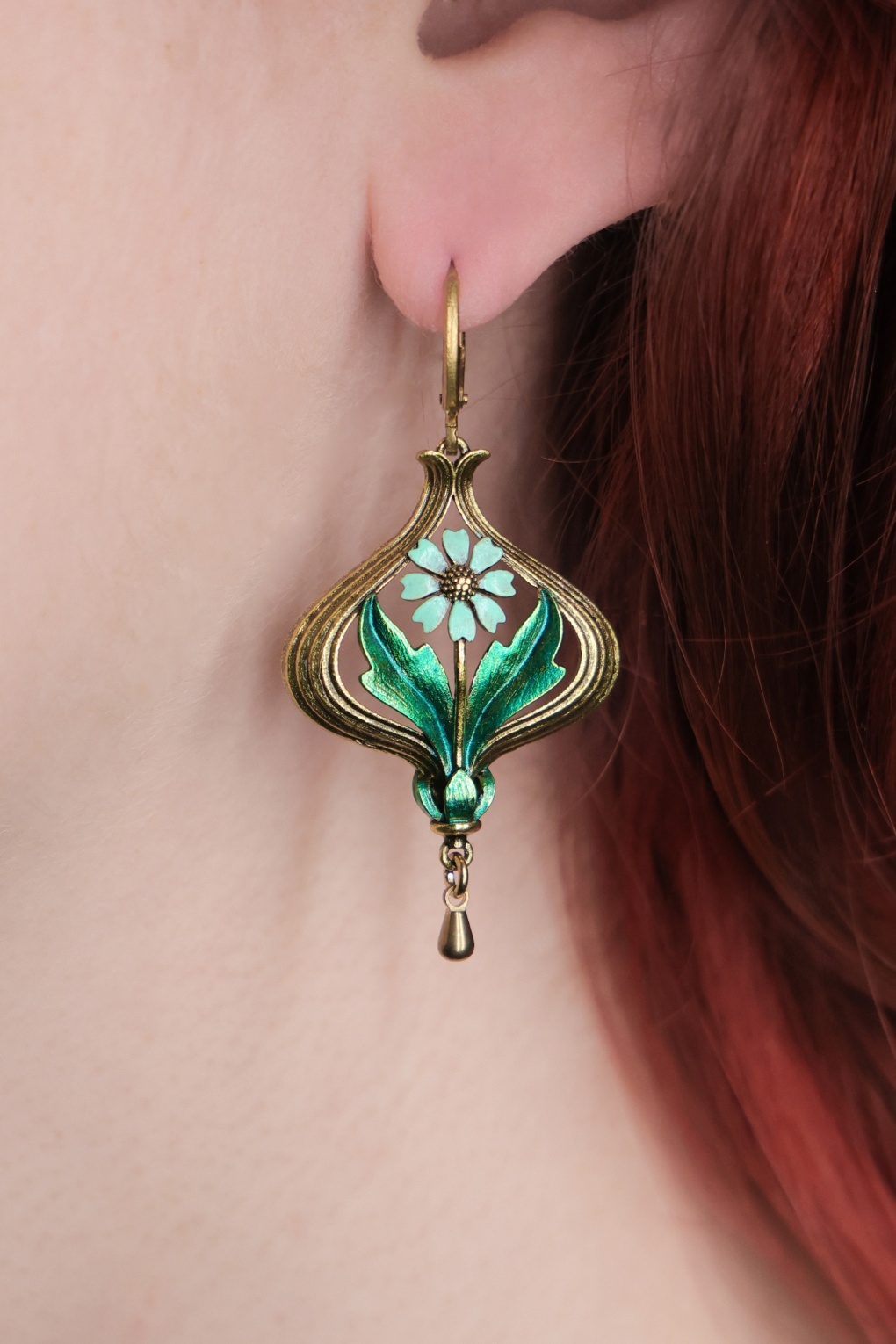 Oui, oui… het ontwerp voor deze oorbellen is geïnspireerd op antieke Franse hangers! Uitgevoerd in goudkleurig metaal voorzien van een bloemvormige hanger in aquablauw en groen, die handbeschilderd en geglazuurd is in hun eigen atelier in Eindhoven. * Ringetjes met scharniersluiting * Nikkelvrij (anti-allergeen) * Wordt geleverd in een leuk doosje