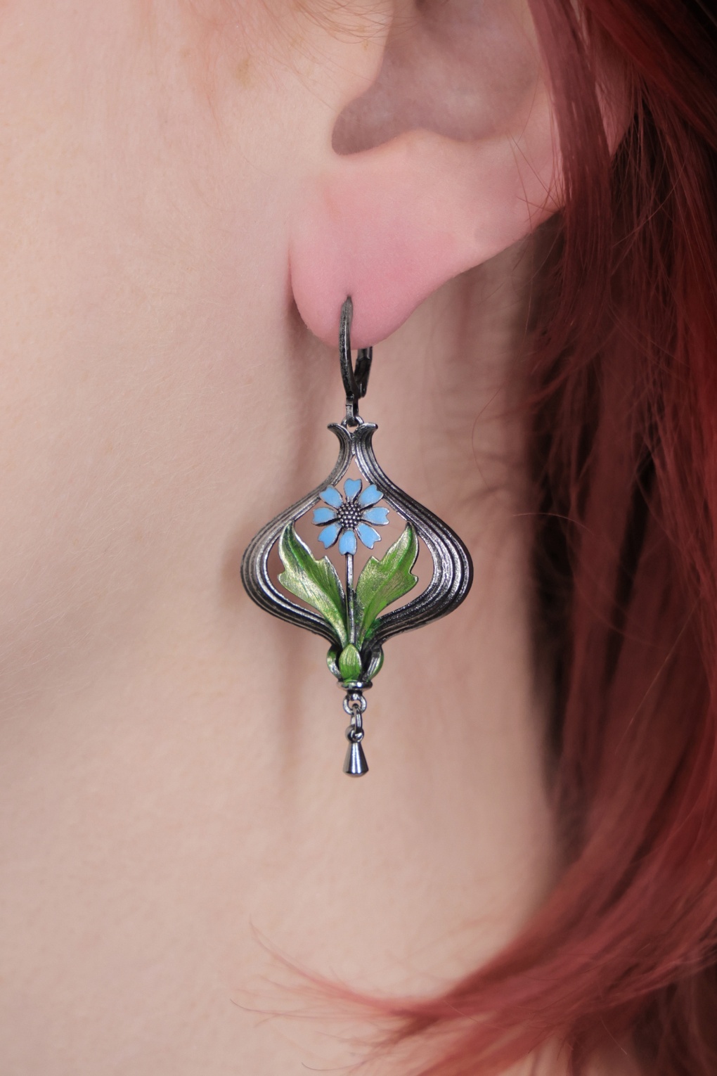 Oui, oui… het ontwerp voor deze oorbellen is geïnspireerd op antieke Franse hangers! Uitgevoerd in zilverkleurig metaal voorzien van een bloemvormige hanger in lichtblauw en groen, die handbeschilderd en geglazuurd is in hun eigen atelier in Eindhoven. * Ringetjes met scharniersluiting * Nikkelvrij (anti-allergeen) * Wordt geleverd in een leuk doosje