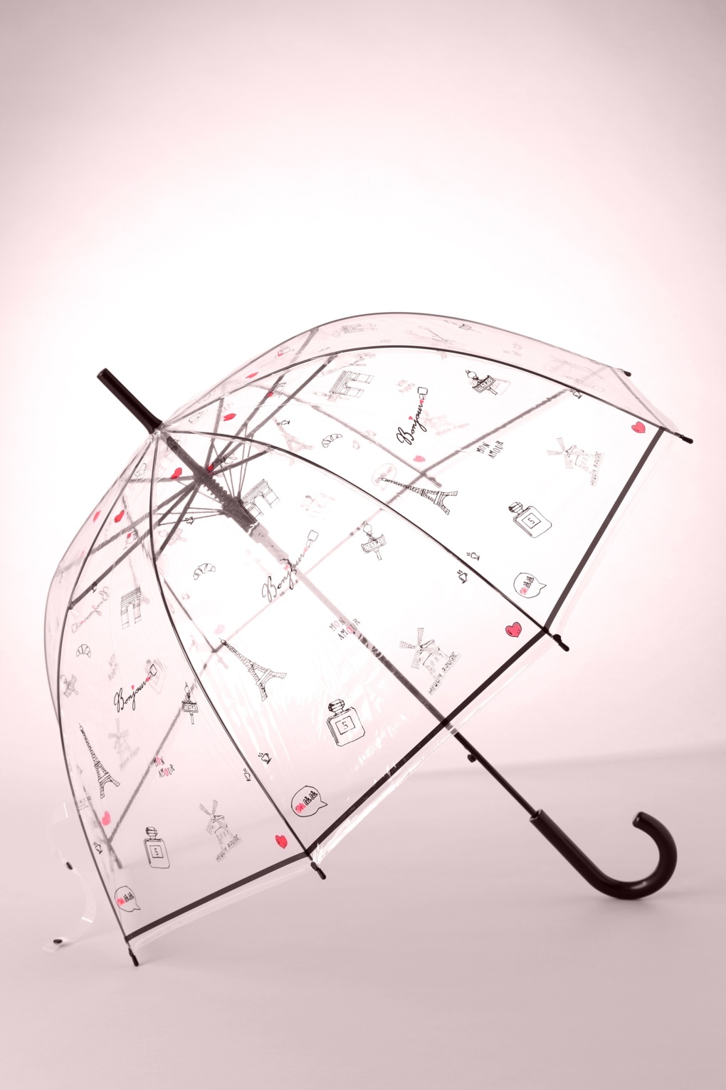 Handig en schattig deze 60s Bonjour Paris Transparent Dome Umbrella, je ziet precies waar je loopt in de regen! Dit schattige exemplaar is voorzien van al het moois dat Parijs te bieden heeft en zorgt ervoor dat jij de regen uit de lucht kijkt! Het transparante scherm is gemaakt van waterdicht polyester en is afgewerkt met een zwart kunststof handvat. De paraplu opent eenvoudig met één druk op de knop. Paris is always a good idea! * 100% waterdicht * Stevig handvat * Opent eenvoudig met één druk op de knop