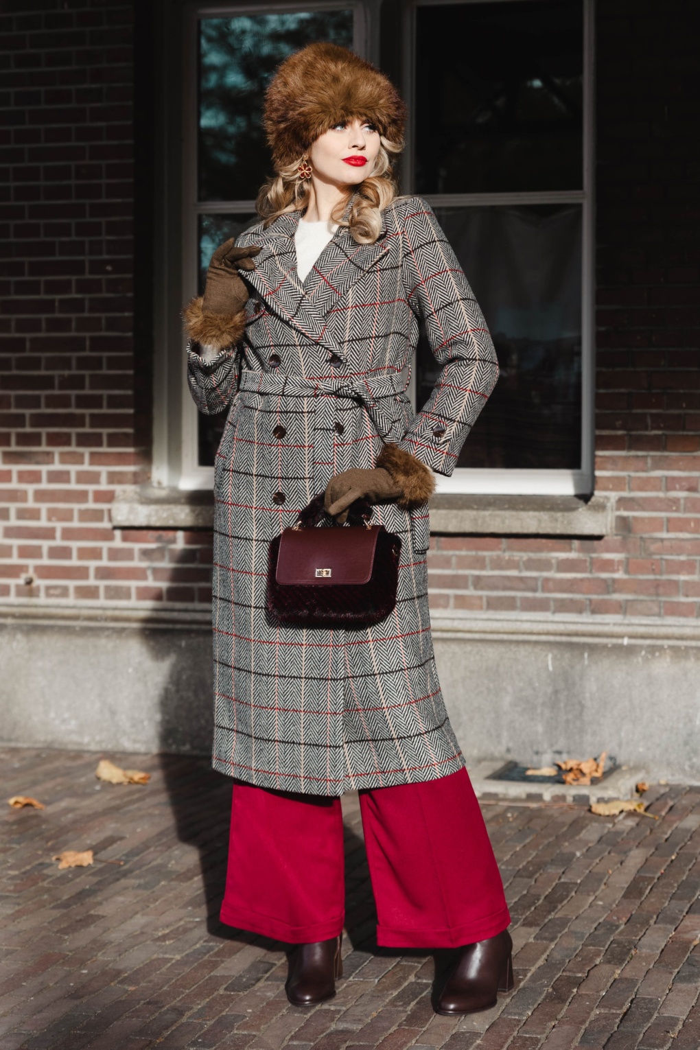 “Structured herringbone, check-print charm… trenchcoat style redefined.” Deze lange jas in trenchcoat stijl is uitgevoerd in een zware kwaliteit, beige stofmix met wol (stretcht niet!), voorzien van een visgraatmotief en ruitjes oranje en bruintinten. Bovendien is ze volledig gevoerd met een satijnachtig stofje voor extra draagcomfort. * Trenchcoat stijl * Puntige reverskraag * Gevoerd * It has pockets! * Afneembare strikband voor een extra ‘snatched’ taille * Dubbele knopenreeks * Split achterzijde * Valt bij een lengte van 1,70 m over de knie * Melissa is 1,78 m