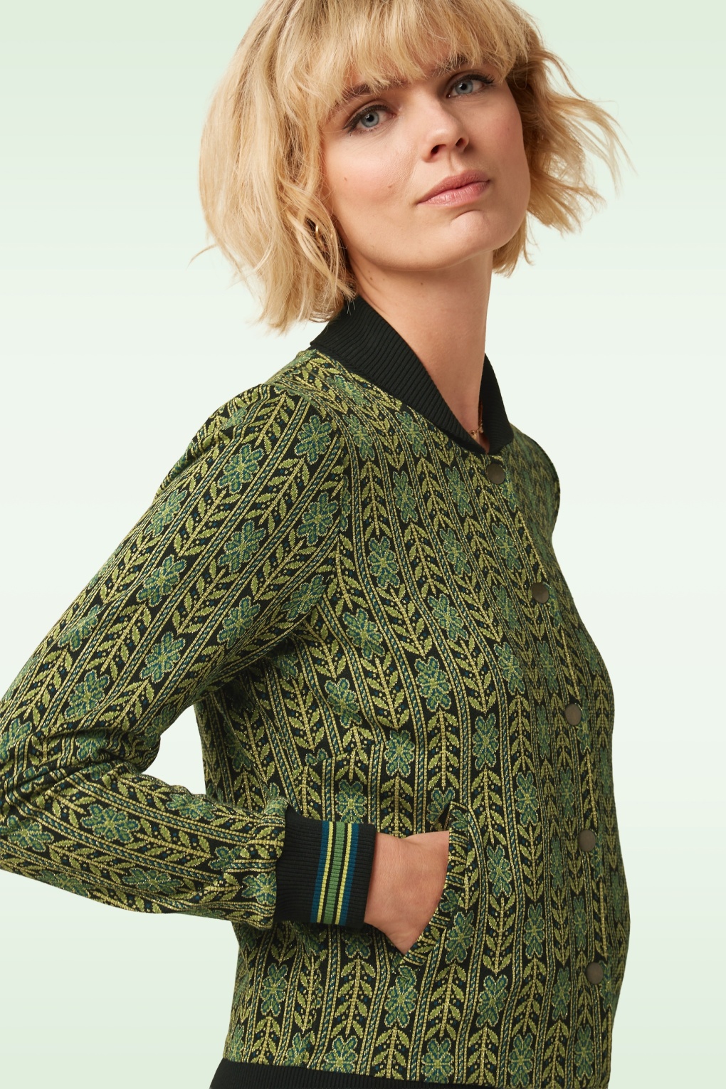 “Get your groove on… seventies style!” Dit korte jack bewijst dat stoer en sparkly met gemak samen gaan. De bloemenprint met groene accenten wordt extra opvallend door de subtiel ingewerkte gouden glitterdraad — voor een vleugje glam met retro flair. De drukknopen en elastische boorden geven haar die kenmerkende look, terwijl de zachte, stevige stofmix met lichte stretch zorgt voor een perfecte fit en heerlijk draagcomfort. Draag haar als jasje of open als vestje voor een look die net zo groovy is als jij! * Ronde halslijn met omslag kraagje * Lange mouwen * Steekzakjes * Drukknoopjes * Stretchy ribboorden