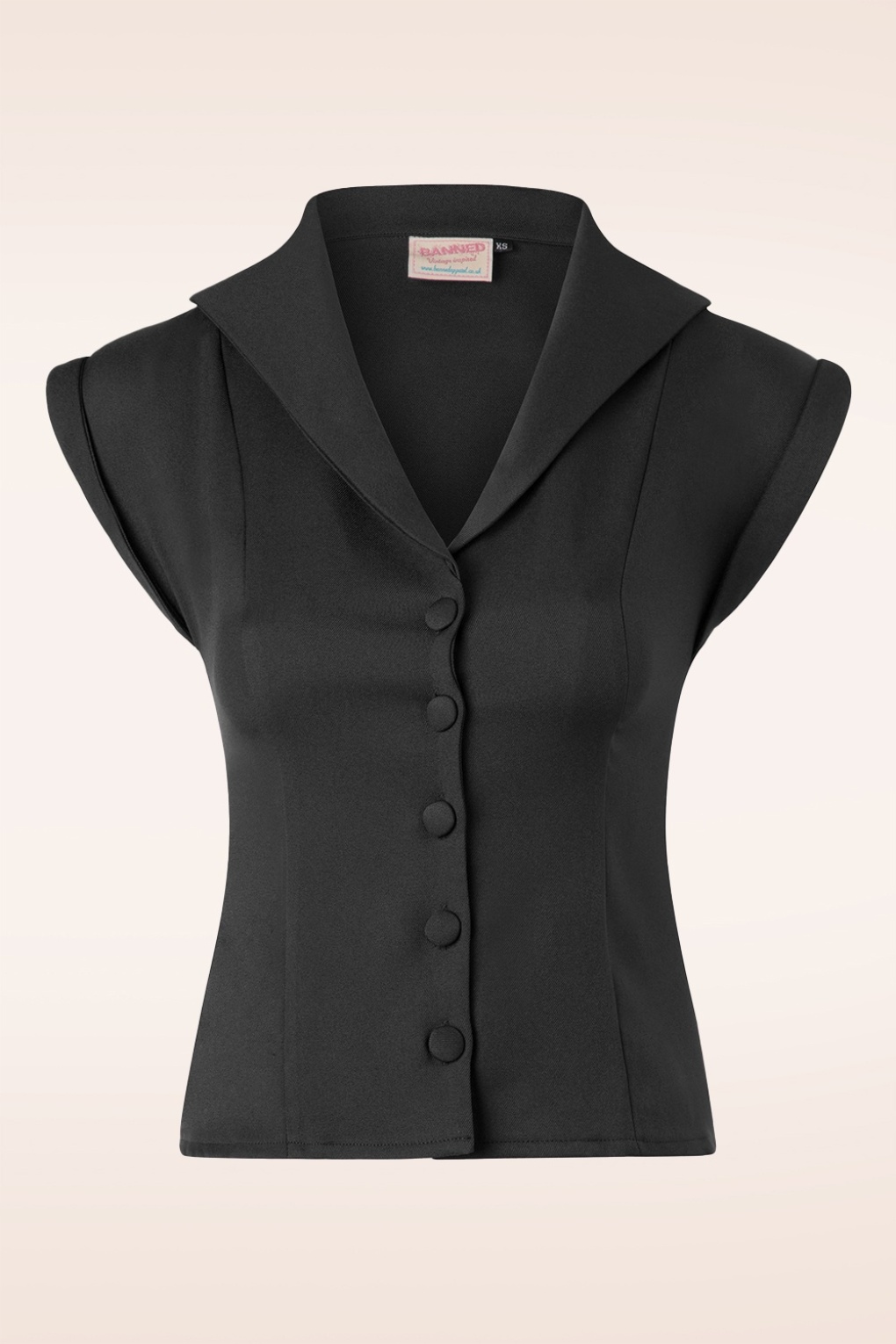 Op zoek naar een mooie basic blouse voor al je retro outfits? Dan is deze Dream Master Short Sleeve Blouse de ”perfect match” 😉 Uitgevoerd in een soepel zwart stofje met een lichte stretch voor een perfecte pasvorm. Prachtig te combineren met een van onze high waist broeken of met een pencil rok voor een sexy vrouwelijke power look! * V-halslijn * Speels kraagje * Korte mouwtjes met omslagjes * Reeks stoffen knopen