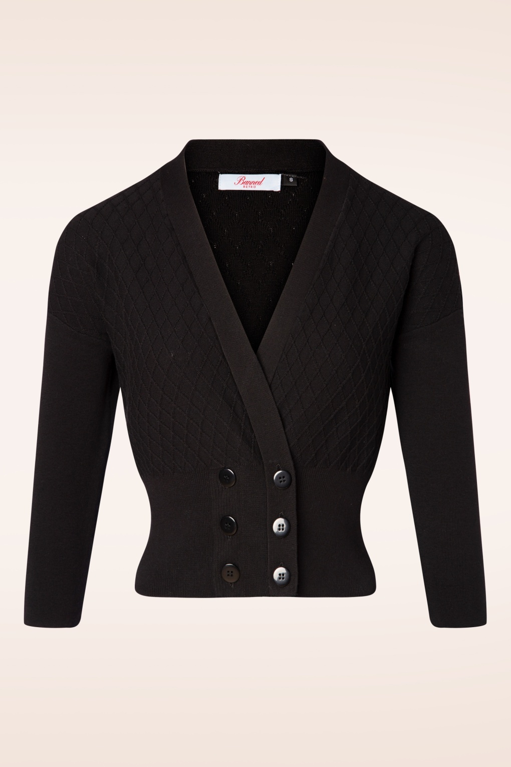 De 50s Emily Cardigan in Black maakt met iedere outfit een ‘perfect match’! Emily is klassiek, comfortabel én speels. Ze heeft een subtiele overslag, een dubbele knopenreeks en 3/4 mouwen. Uitgevoerd in een zachte en soepele, fijngebreide, zwarte katoen met een ruitpatroon voor een aangename pasvorm. De combinatiemogelijkheden zijn eindeloos!   * Subtiele overslag * 3/4 mouwen * Dubbele knopenreeks