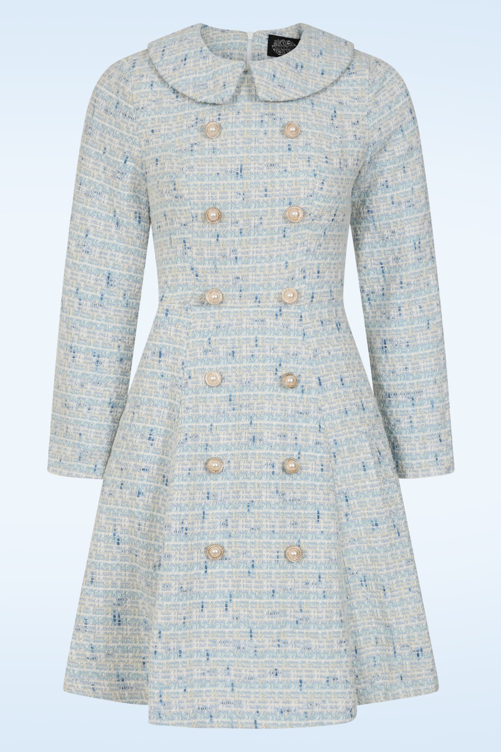 “Luxury you can feel, grace you can wear.” Grace heeft een speels kraagje, lange mouwen, opvallende goudkleurige sierknopen en een speelse a-lijn snit. Uitgevoerd in een iets dikkere, stevige maar soepele bouclé achtige stof (stretcht amper) in wit en blauwtinten die heerlijk draagt. * A-lijn * Kraagje * Lange mouwen * Dubbele ‘faux’ knopenrij * Zijwaartse steekzakken * Blinde rits achterkant * Geheel gevoerd * Valt bij een lengte van 1,70 m op de knie