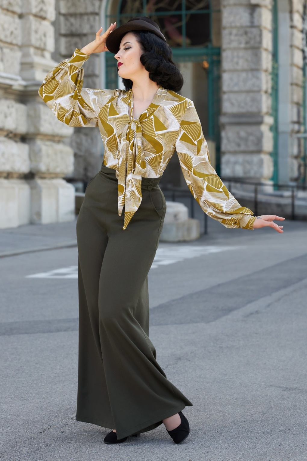 Maak een statement, waar je ook gaat, met deze veelzijdige pantalon, afkomstig uit de nieuwe collectie van Miss Candyfloss: ”Vintage Glam Icons”. De collectie is geïnspireerd op de glamoureuze eerste super modellen! Haidee Juniper is uitgevoerd in een stevige maar soepele olijfgroene stofmix met een vleugje viscose en een fijne stretch, voor een comfortabel draagcomfort. * Hoog taille model * Zijwaartse steekzakken * Paspelzakjes achterzijde * Knoopsluiting zijkant * Verborgen ritssluiting * Rechte, wijde pijp