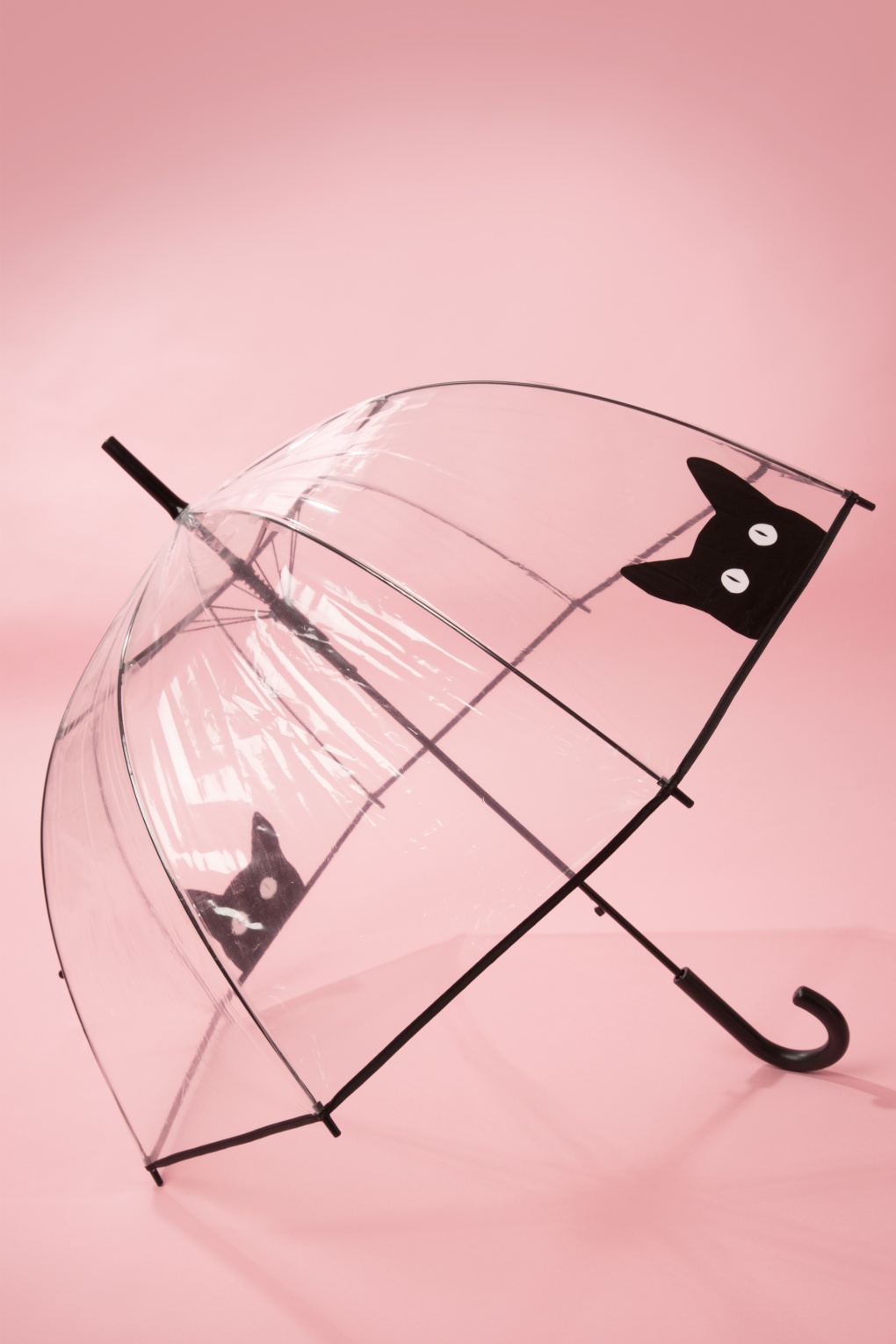Handig en stylish deze 50s It’s Raining Cats Transparent Dome Umbrella, je ziet precies waar je loopt in de regen! De paraplu bevat een zwart kunststof handvat en het transparante scherm is gemaakt van waterdicht polyester met een klein zwart randje en een super leuke print van een zwart katje. Begint het opeens hard te regenen? Druk snel op de knop en *plop* je bent gered. I’m singin’ in the rain! * 100% waterdicht * Stevig handvat * Opent eenvoudig met één druk op de knop * De afgebeelde jas, top, rok en pumps zijn niet verkrijgbaar in onze shop.