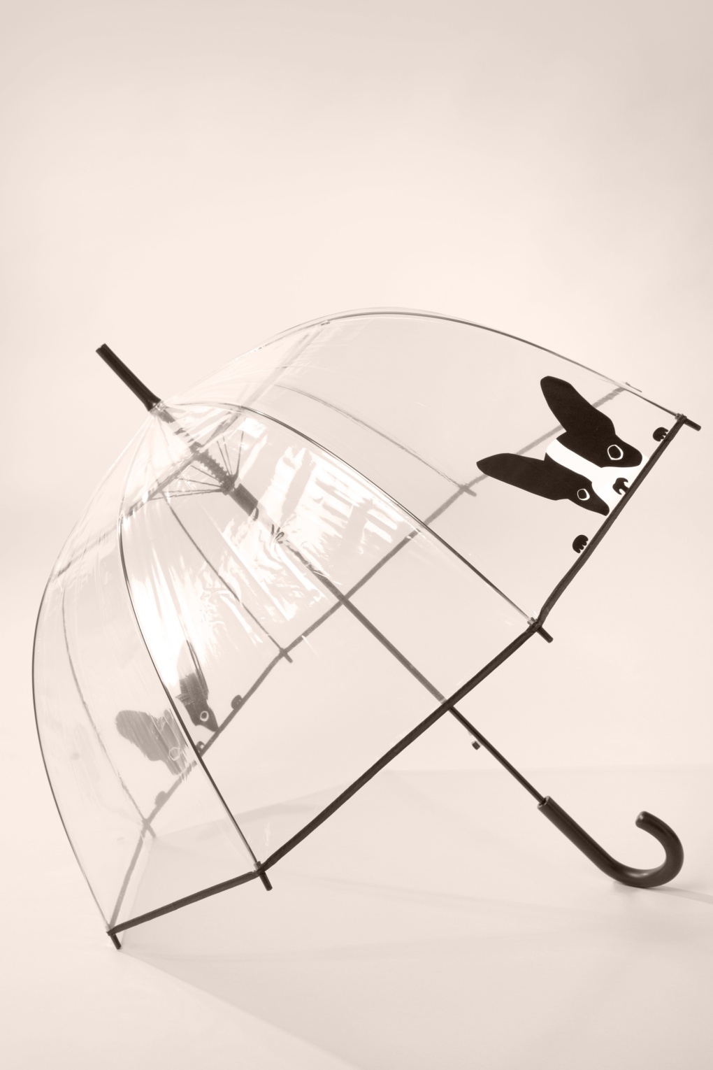 Handig en stylish deze 50s It’s Raining Dogs Transparent Dome Umbrella, je ziet precies waar je loopt in de regen! De paraplu bevat een zwart kunststof handvat en het transparante scherm is gemaakt van waterdicht polyester met een klein zwart randje en een super leuke print van een hond. Begint het opeens hard te regenen? Druk snel op de knop en *plop* je bent gered. I’m singin’ in the rain! * 100% waterdicht * Stevig handvat * Opent eenvoudig met één druk op de knop