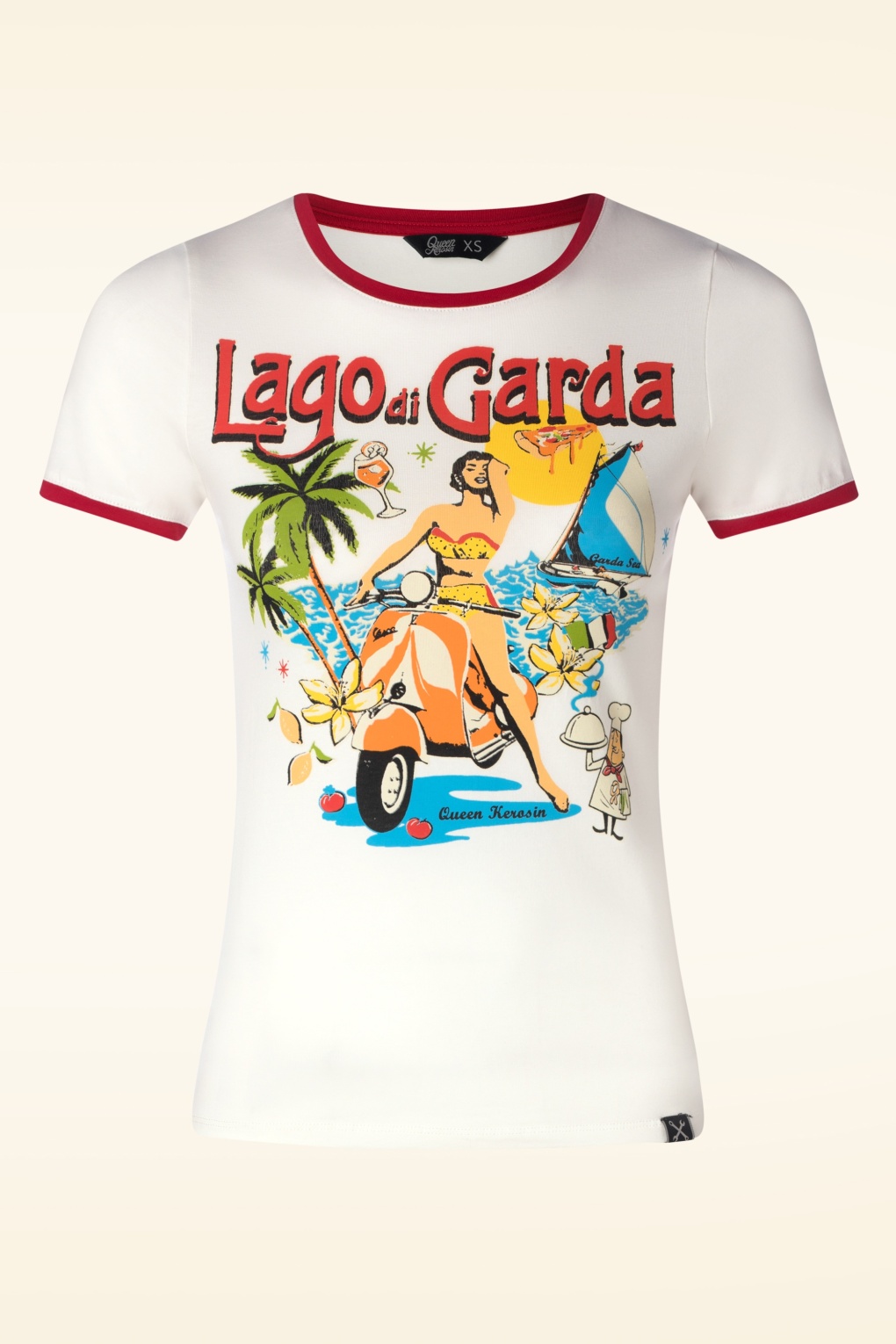 ”Lago di Garda, baby!” Dit shirtje heeft lipstickrode biezen en een TE leuke print. Daarnaast is ze uitgevoerd in een heerlijke stretchy katoenmix in gebroken wit die een genot is om te dragen. * Lang genoeg om op een normale heupbroek te dragen