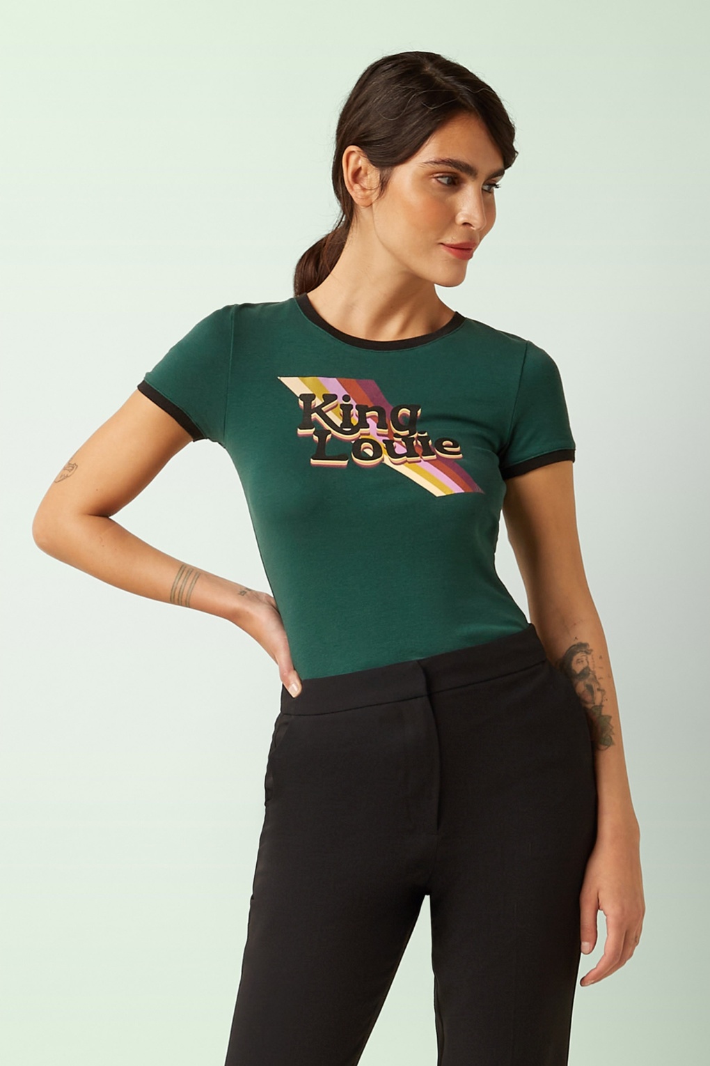 ”It’s definitely a T-Shirt kinda day!” Altijd in stijl en uitgevoerd in een luchtige en stretchy, donkergroene, biologische katoenmix voor een heerlijk draagcomfort. De contrasterende zwarte biesjes en het King Louie logo in seventies stijl maakt het geheel helemaal af. * Ronde halslijn * Korte mouwen * Lang genoeg om op een normale heupbroek te dragen