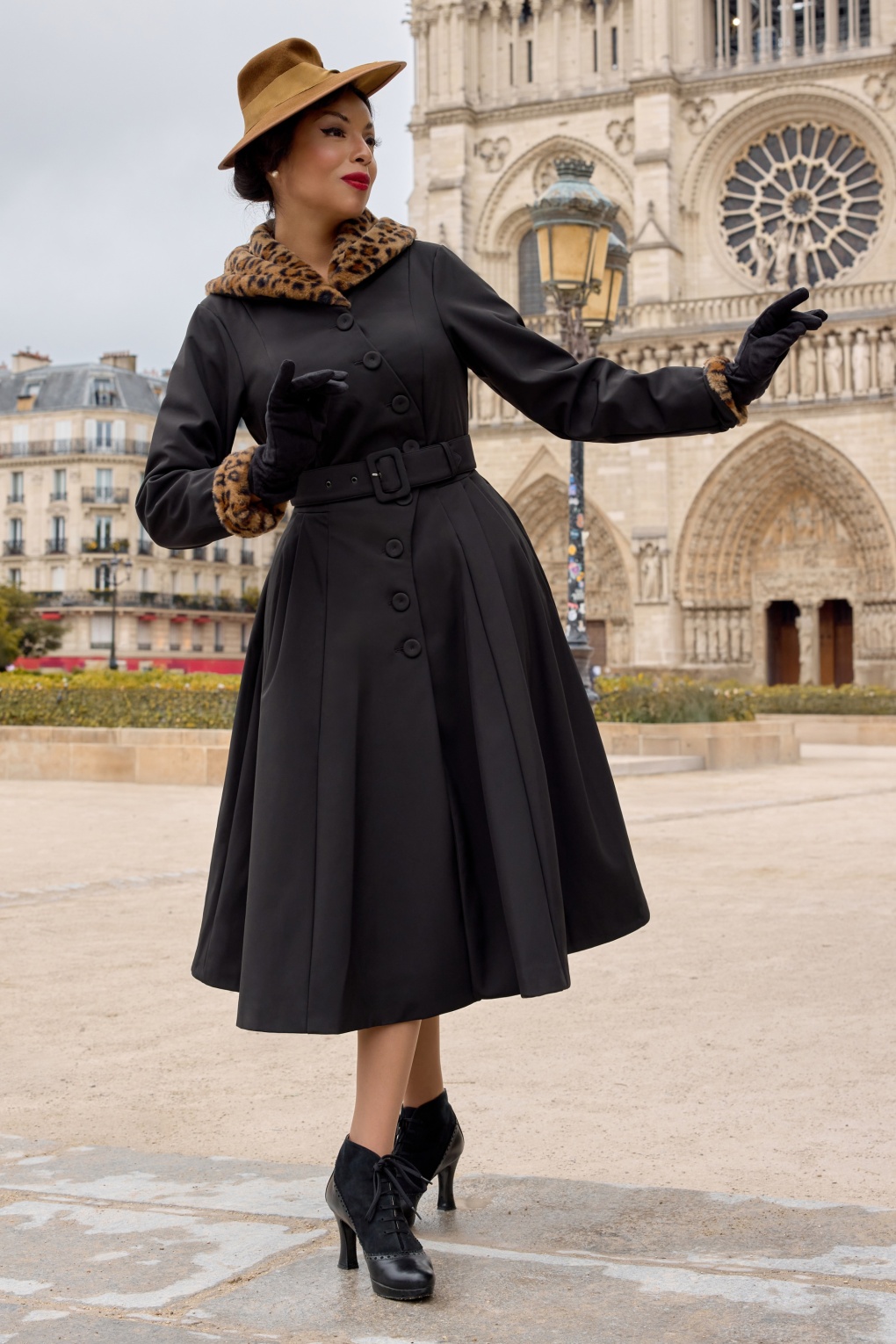 “A tribute to timeless femininity; where soft tailoring meets the romance of Parisian winters.” Deze swing mantel uit de nieuwe collectie is geïnspireerd op de extraordinaire Marie-Louise Carven; Een baanbrekende Franse couturière uit de jaren 40 en 50! Ze heeft een imitatiebontkraag en mouwboorden met een speels leopard printje en een handige capuchon. Ze is uitgevoerd in een waterafstotende, zwarte stof en is voorzien van een reeks asymmetrische functionele knopen en een afneembare riem. Draag haar met elegantie en stijl! * Swing stijl * Waterafstotend * Vaste imitatiebontkraag * Capuchon * Lange mouwen met imitatiebont * Asymmetrische knopenreeks * Afneembare riem, voor een extra ‘snatched’ taille * Zijwaartse steekzakken * Zakken binnenkant * Volledig gevoerd * Valt bij een lengte van 1,70 m over de knie