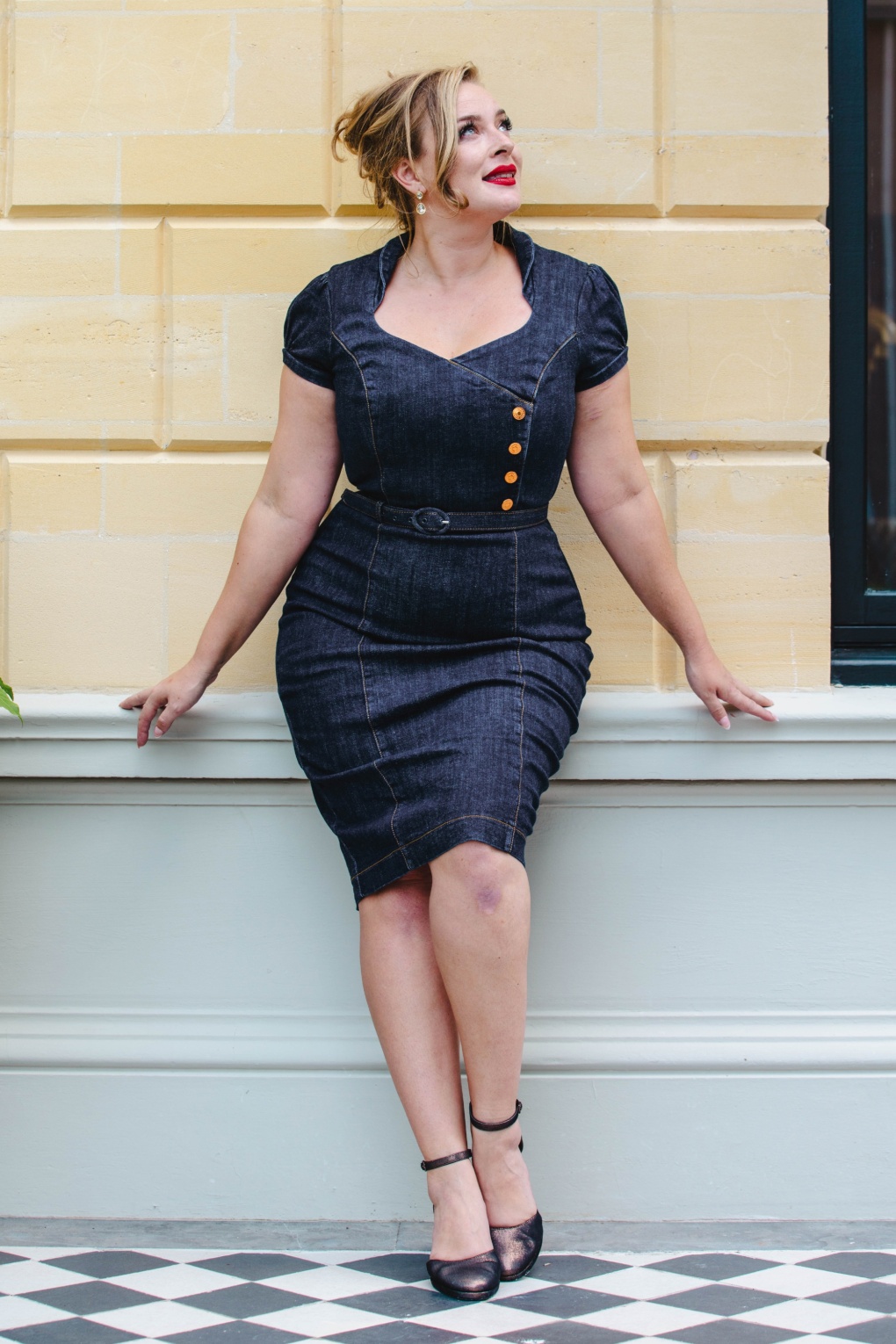 ”In the right denim a woman can conquer the world!’ Lydia is uitgevoerd in een prachtige stevige, donkere denimblauwe katoenmix met een fijne stretch, volgt je rondingen perfect en is afgewerkt met geel stikwerk voor die authentieke touch. Rock your booty… uhhh… body in deze curve-hugging denim dress! 😉 * Pencil stijl * Klein opstaand kraagje * Korte pofmouwtjes * Sierknoopjes * Afneembare riem * Split achterzijde * Blinde rits achterzijde * Gorgeous Nicky is 1,62 m * Let op; de kleur van het product op de video kan afwijken van de daadwerkelijke kleur van het product