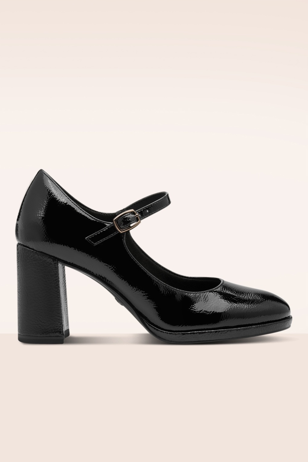 “Glossy steps and girlish charm” Deze Mary Jane stijl pumps zijn uitgevoerd in zwart vegan lakleder, voorzien van een subtiel plateau, een zacht voetbed en een schok absorberende, hoge blokhak. * Mary Jane stijl pump * Verstelbaar bandje * Schok absorberende, hoge blokhak * Subtiel plateau * Comfortabel ’touch it’ voetbed * Vegan approved