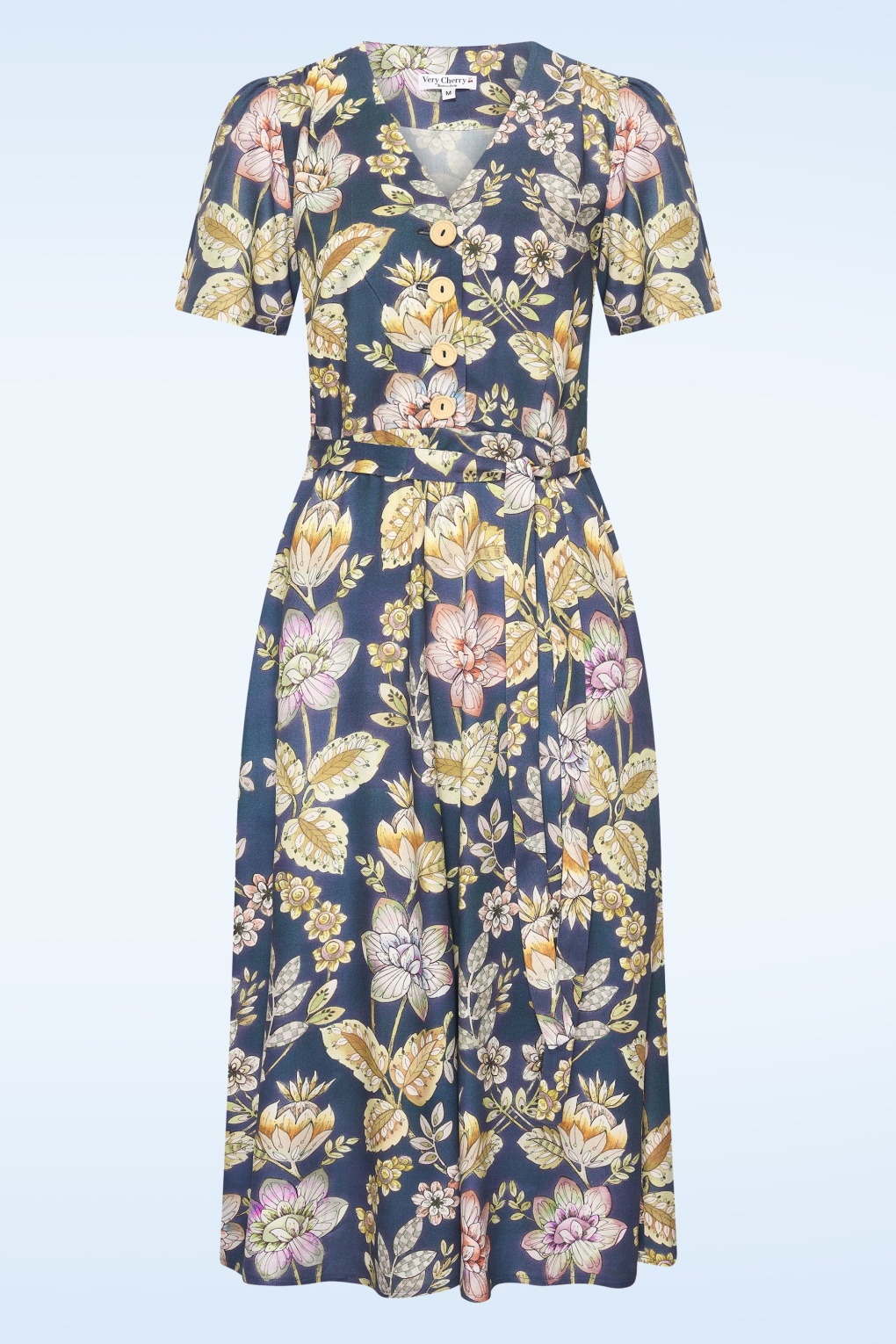 ”Blossoming beauty!” Wij worden helemaal gelukkig van deze Magnolia jurk! Ze heeft een elegante V-halslijn, korte pofmouwen, loopt vanaf de taille uit in een flowy semi-swing rok met handige steekzakken. Uitgevoerd in een luchtige en soepele, donkerblauwe 100% viscose (stretcht niet) voorzien van een lieflijke bloemenprint in zachte tinten. * Semi-swing model * V-halslijn * Korte pofmouwen * Knopenrij * Afneembaar striklint voor een extra ‘snatched’ taille * It has pockets! * Blinde rits zijkant * Valt bij een lengte van 1,70 m ruim over de knie