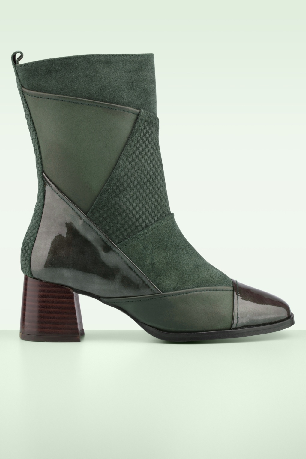 “Texture speaks louder than colour; khaki in layers of attitude.” Deze laarsjes zijn uitgevoerd in een combinatie van kakigroen leder, suède en lakleder met een niet al te hoge blokhak. De zachte binnenzool van leder zorgt bovendien voor een fantastische pasvorm. * Halfhoge laarsjes (reiken tot over de enkel) * Echt lakleder/leder/suède * Ritssluiting zijkant * Blokhak * Comfortabel lederen voetbed * Anti-slip zool