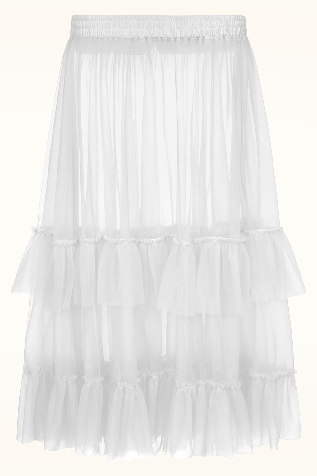 ”Behind every great twirl is a trusty petticoat!” Deze subtiele petticoat zorgt voor extra volume, beweegt gracieus met je mee en is afgezet met speelse ruches. Uitgevoerd in een witte tule stof en afgewerkt met een elastieken band. Deze petticoat geeft iedere swing jurk net dat beetje extra! * Geschikt voor al onze swing dresses en rokken * Elastische tailleband * Valt over de knie bij een lengte 1,70 m