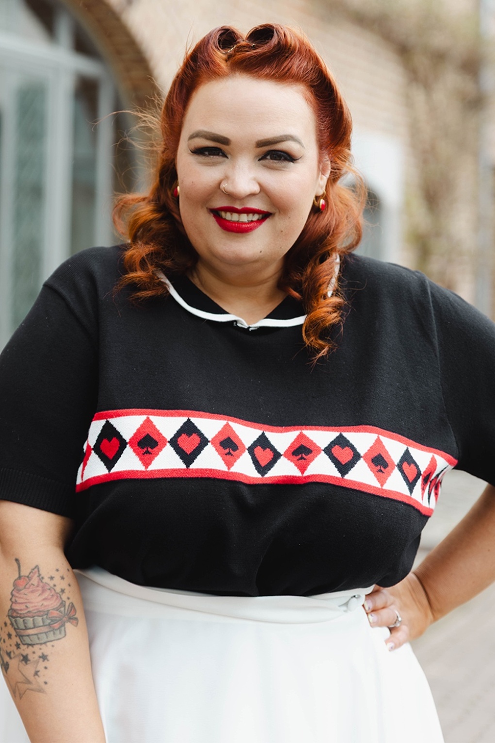 ”Deal me in!” Dit gebreide truitje heeft een schattig Peter Pan kraagje, korte mouwtjes en is uitgevoerd in een zachte, stretchy, zwarte viscosemix met een ‘spelkaarten’ print van schoppen en harten. * Peter Pan kraagje * Korte mouwtjes * Stretchy ribboorden * Lang genoeg om op een mid-waist broek of rok te dragen