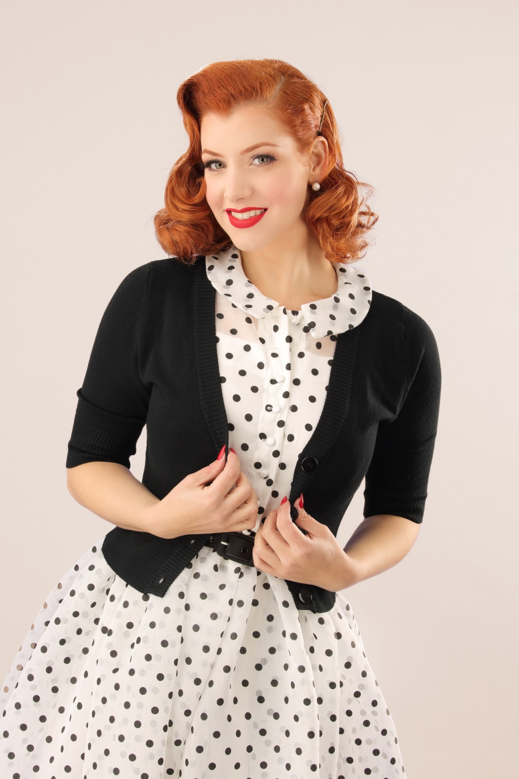 De 50s Overload Cardigan is een echte klassieker! Classy in al haar eenvoud en daardoor DE perfecte match met al jouw vintage kledingstukken! Deze korte cardi heeft een elegante V-halslijn, 1/2 mouwen en grote glimmende knopen. Uitgevoerd in een fijngebreide, zwarte viscosemix met een heerlijke stretch voor een mooie aansluitende pasvorm. De combinatiemogelijkheden zijn eindeloos!   * V-halslijn * 1/2 mouwen * Reeks knopen * Stretchy ribboord langs de halslijn, mouwen en onderkant * Korter stijltje