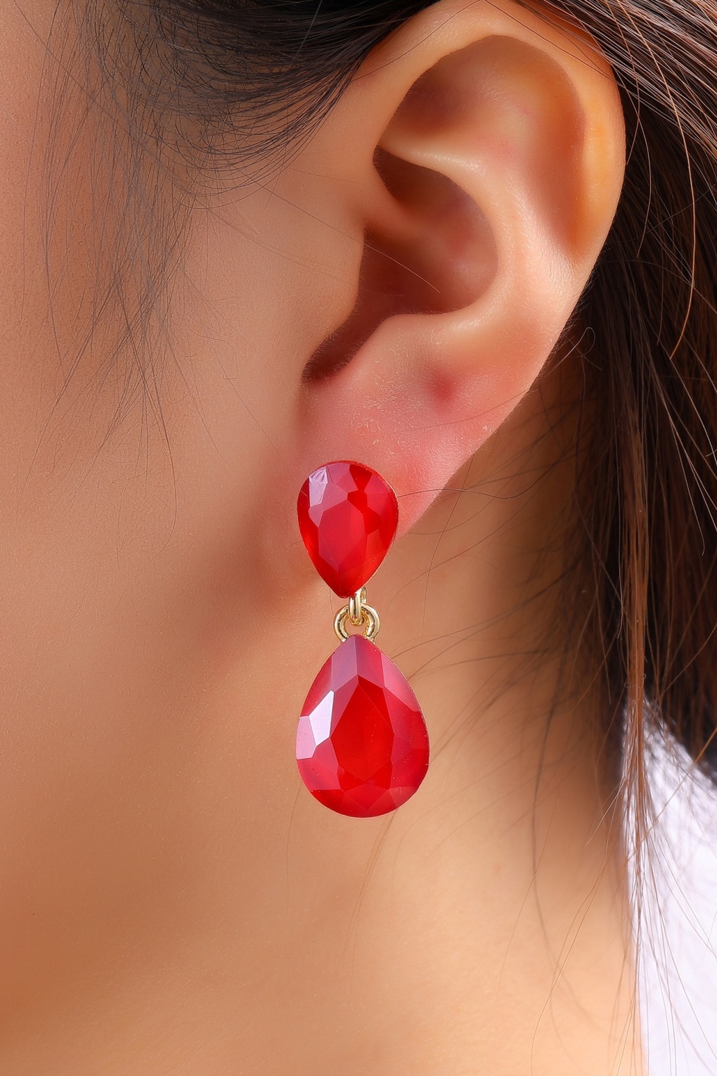 “Crimson charm on point.” Deze goudkleurige stekers zijn voorzien van rode, druppelvormige facet geslepen stenen. * Goudkleurig onedel metaal * ‘Faux’ diamantjes * Stekers met stoppertjes * Nikkelvrij