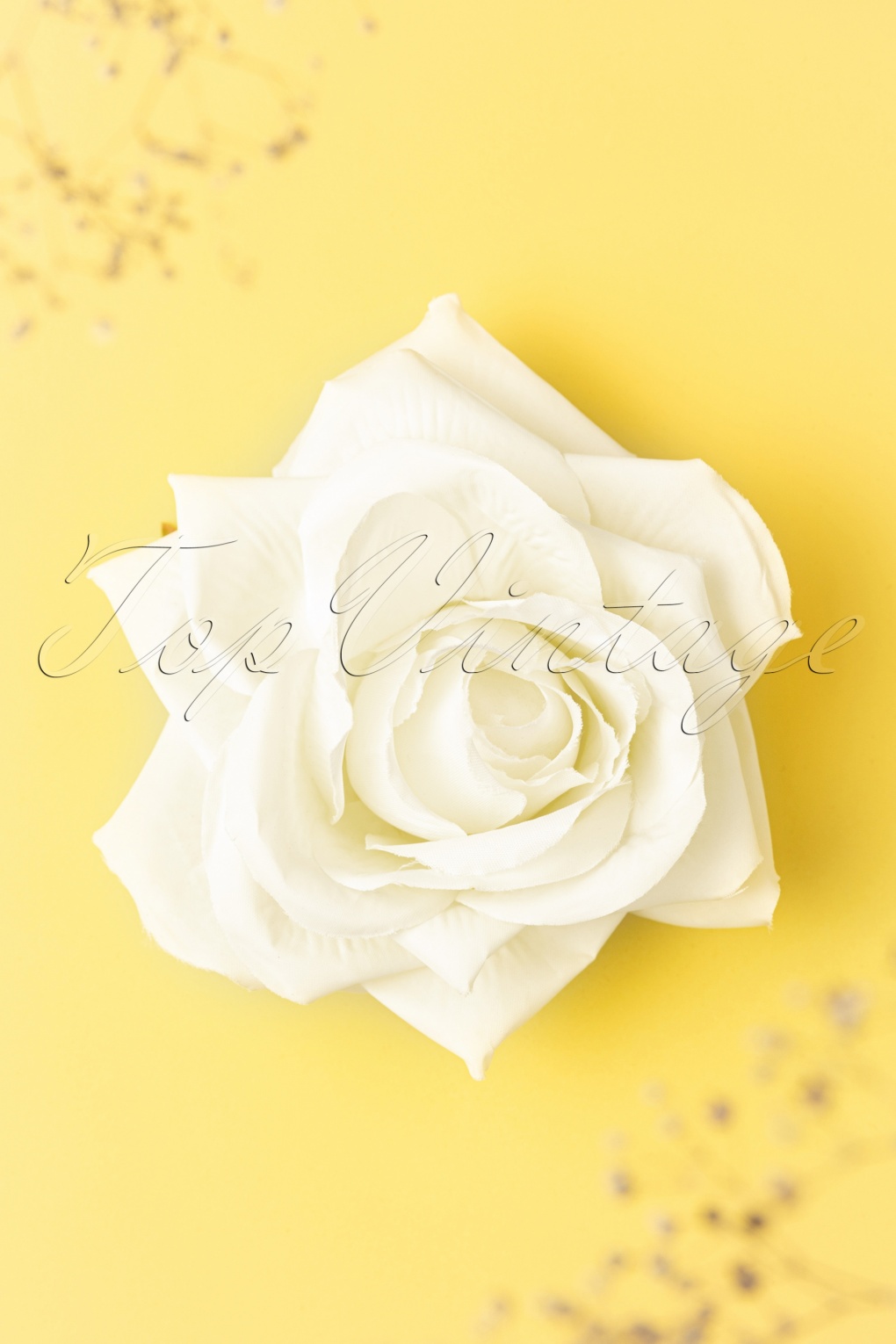 Bij een (vintage) outfit hoort natuurlijk een elegant kapsel! En met deze 50s Scented Love Flower Hair Clip in Creamy White in je haar is het plaatje compleet! Deze prachtige crèmekleurige roos is voorzien van een stevige zilverkleurige clip zodat ze goed blijft zitten in je haar. Draag je deze roos liever op je kleding? Geen probleem dankzij de extra pinsluiting! ”Time to bloom!” * Zilverkleurige haarclip * Zilverkleurige pinsluiting