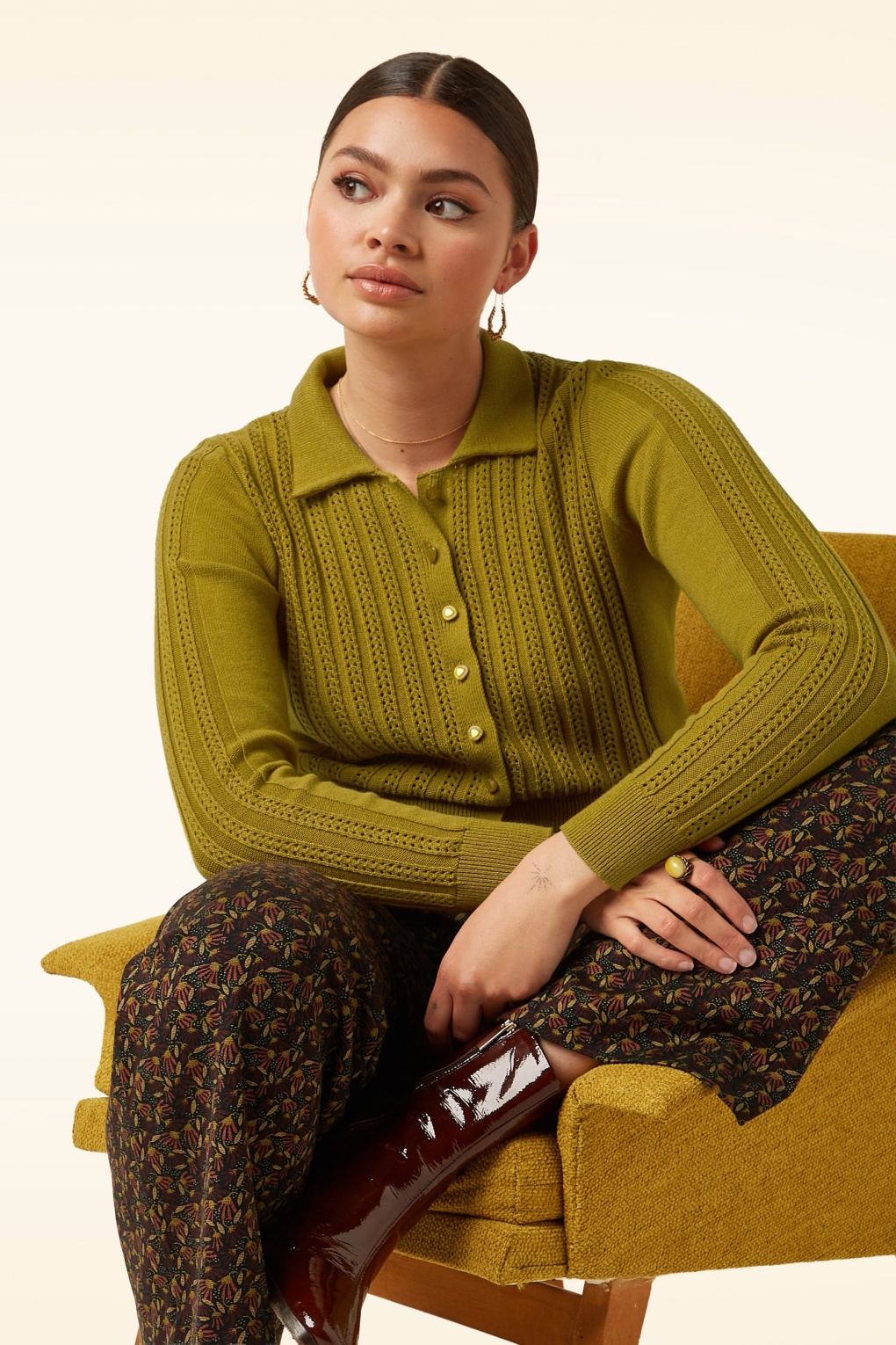 “Where comfort meets timeless charm!” Laat de zon in je garderobe schijnen met dit prachtige vestje in currygeel. Ze heeft een puntig kraagje, lange mouwen en een verfijnd opengewerkt patroon dat die typische seventies flair toevoegt. Uitgevoerd in een zachte katoenmix met een vleugje kasjmier voor extra luxe en draagcomfort. Perfect om je look een zonnige, retro touch te geven – zelfs op de koelere dagen! * Vest * Puntig kraagje * Lange mouwen * Opengewerkt patroon * Knopenreeks * Stretchy ribboorden * Lang genoeg om op een normale heupbroek te dragen