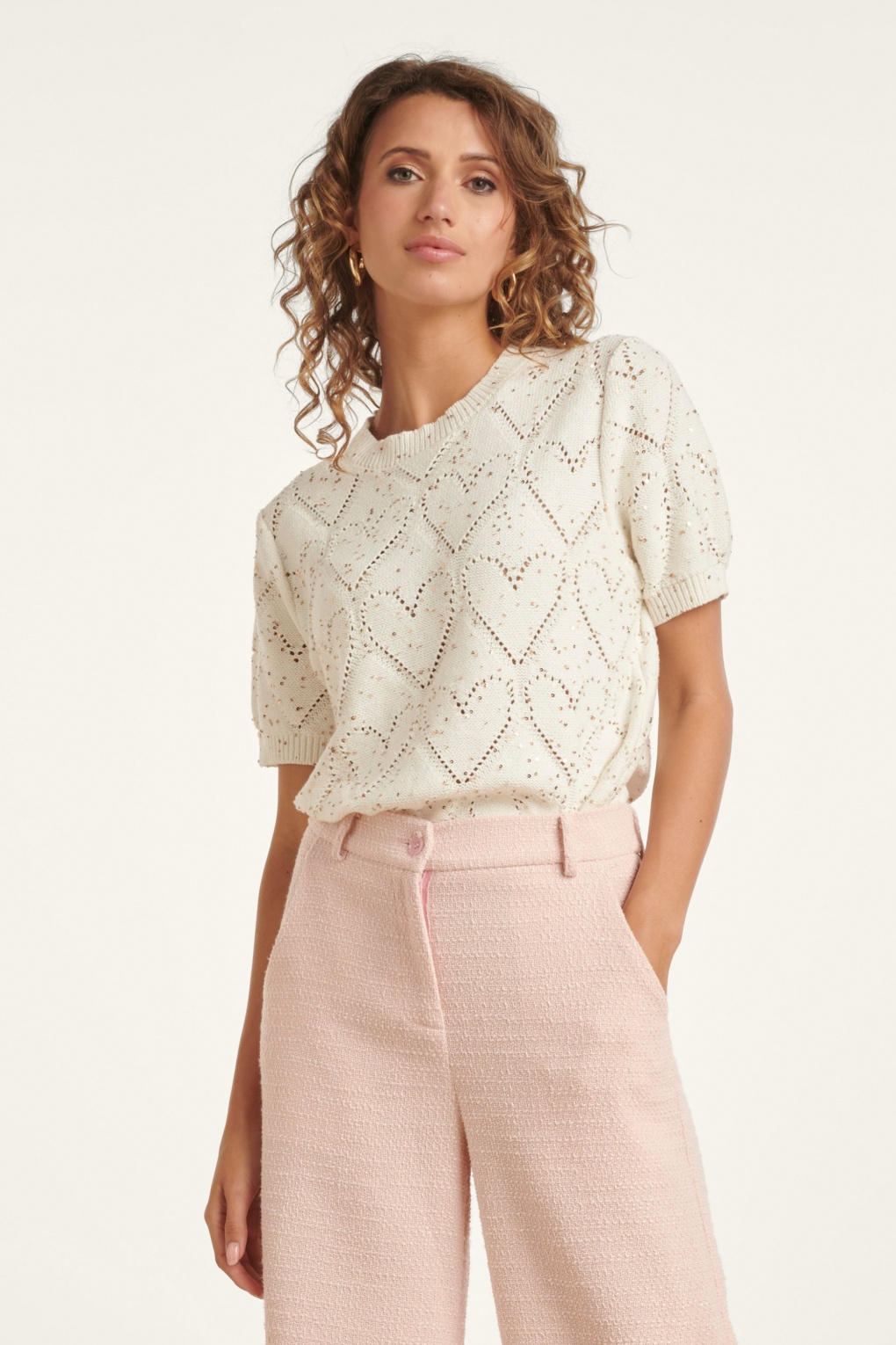 “All we KNIT is LOVE!” Deze cutie is gemaakt van een fijngebreide, stretchy katoenmix in gebroken wit en voorzien van een lieflijk opengewerkt hartjespatroon, afgewerkt met sprankelende gouden glitterpailletten. * Loose fit * 1/2 mouwen * Opengewerkt patroon * Stretchy ribboorden  * Lang genoeg om op een normale heupbroek te dragen