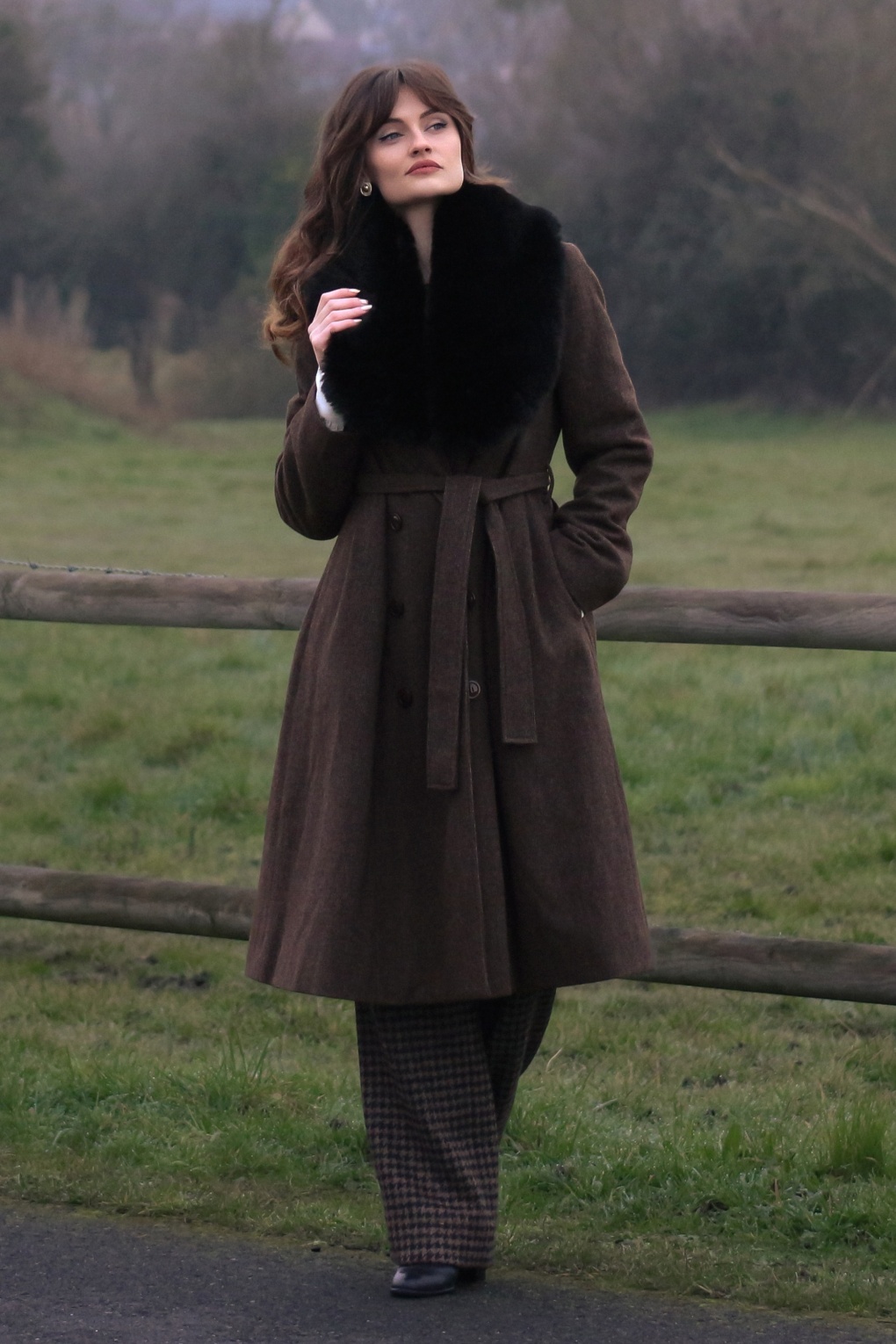 ”A whisper of warmth, wrapped in class and grace!” Deze mantel is exclusief bij Topvintage verkrijgbaar en niet alleen prachtig om te zien, maar ze houdt je ook nog eens heerlijk warm! Uitgevoerd in een luxueuze, ietwat dikkere, donkerbruine wolmix (stretcht niet) met een ruitjesmotief die volledig is gevoerd voor extra comfort. * A-lijn model * Dubbele knopenrij * Geheel gevoerd * Afneembare zwarte kraag van imitatiebont * Lange mouwen * Voorzien van zakken * Afneembaar striklint voor een ‘snatched’ taille * Valt over de knie bij een lengte van 1,70 m * Exclusief bij Topvintage verkrijgbaar