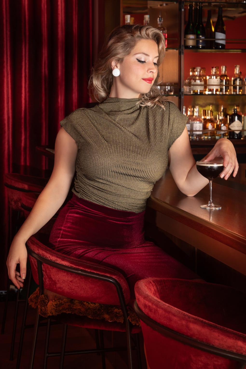 ”Gold is a state of mind!” Iris heeft een hoge halslijn en flatterende plooitjes in de taille. Ze is uitgevoerd in een soepel en stretchy, ribstructuur stofje voorzien van een ingewerkte gouden lurex glitterdraad. * Hoge halslijn * Plooien op de schouders * Flatterende plooitjes in de taille * Niet gevoerd! * Lang genoeg om op een normale heupbroek te dragen * Exclusief bij Topvintage verkrijgbaar