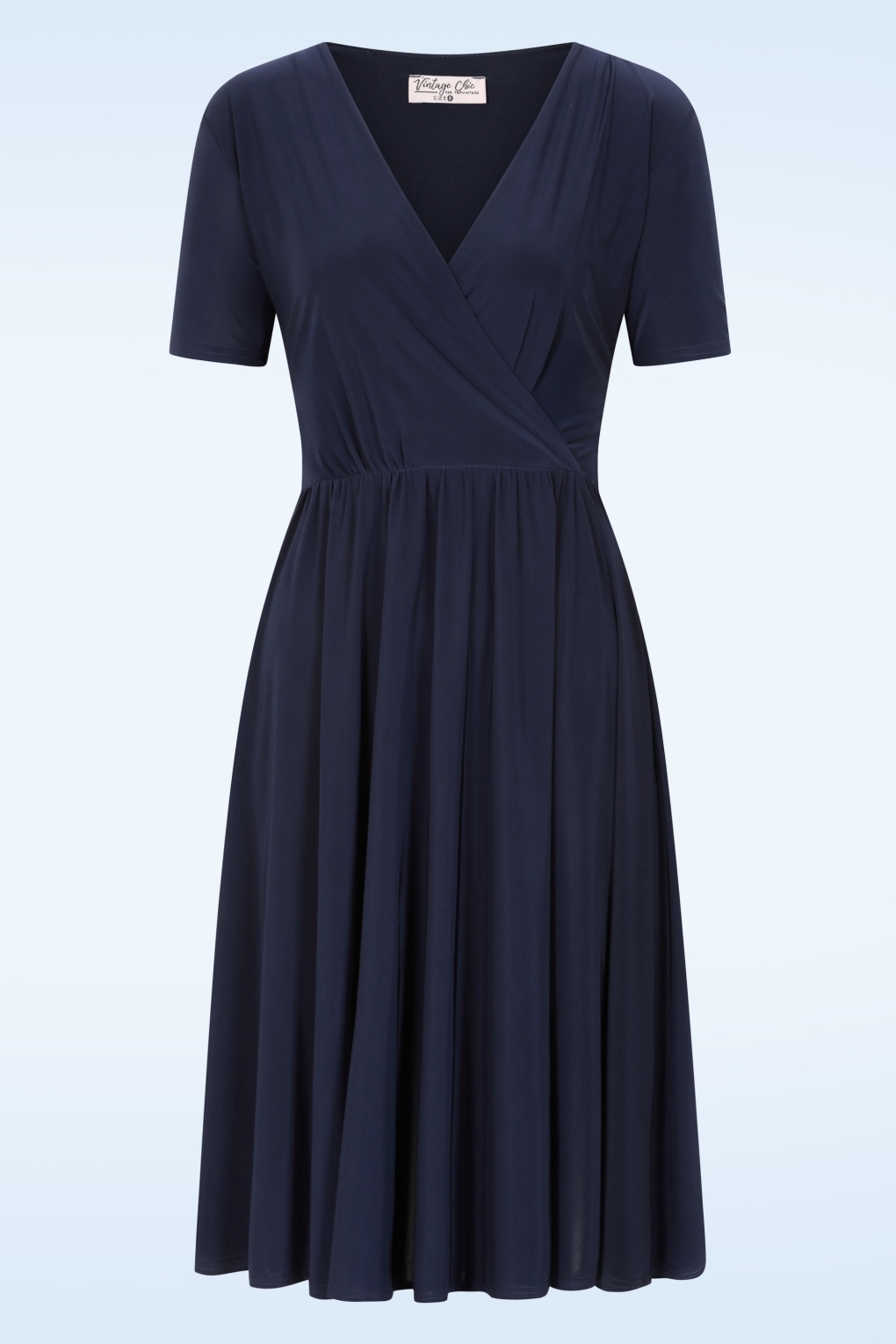 “Simply elegant, endlessly wearable.” Deze semi-swing jurk combineert comfort met een vrouwelijk silhouet. De vaste overslag top is gevoerd en flatterend, terwijl de elastische tailleband heerlijk zit en wordt geaccentueerd door vaste strikbanden, die je zowel voor als achter kunt strikken voor een speelse touch. Ze is uitgevoerd in een glad en soepel, licht glanzend en stretchy marineblauw stofje dat garant staat voor veel kreukvrij draagplezier. Dus ook ideaal om mee op reis te nemen! * Semi-swing model * Vaste overslag top (gevoerd) * Korte mouw * Elastische tailleband * Vaste strikbanden * Valt bij een lengte van 1,70 m net over de knie * Exclusief bij Topvintage verkrijgbaar