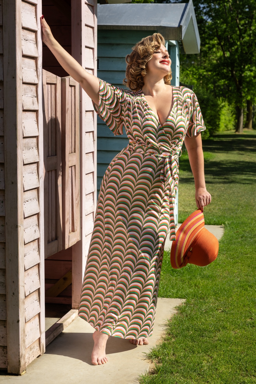 ”She’s giving us real retro vibes!” Groovy Tammy heeft een prachtige aansluitende overslag top met flatterende plooitjes, korte vlindermouwtjes, loopt vanaf de taille over in een flowy maxi rok en is voorzien van een kleurrijk retro printje in roze, groen en bruintinten. Je neemt haar tevens probleemloos óveral mee naartoe… ze is namelijk uitgevoerd in een soepele en stretchy, slinky stof met een lichte glans die licht van gewicht is en niet kreukt.  * Vaste overslag met plooitjes * Gevoerde top voor extra comfort * Korte vlindermouwtjes * Afneembaar matching striklint * Geen rits of knopen; aantrekken en ready to go! * Reikt bij een lengte van 1,70 m tot aan de grond * Exclusief bij Topvintage verkrijgbaar