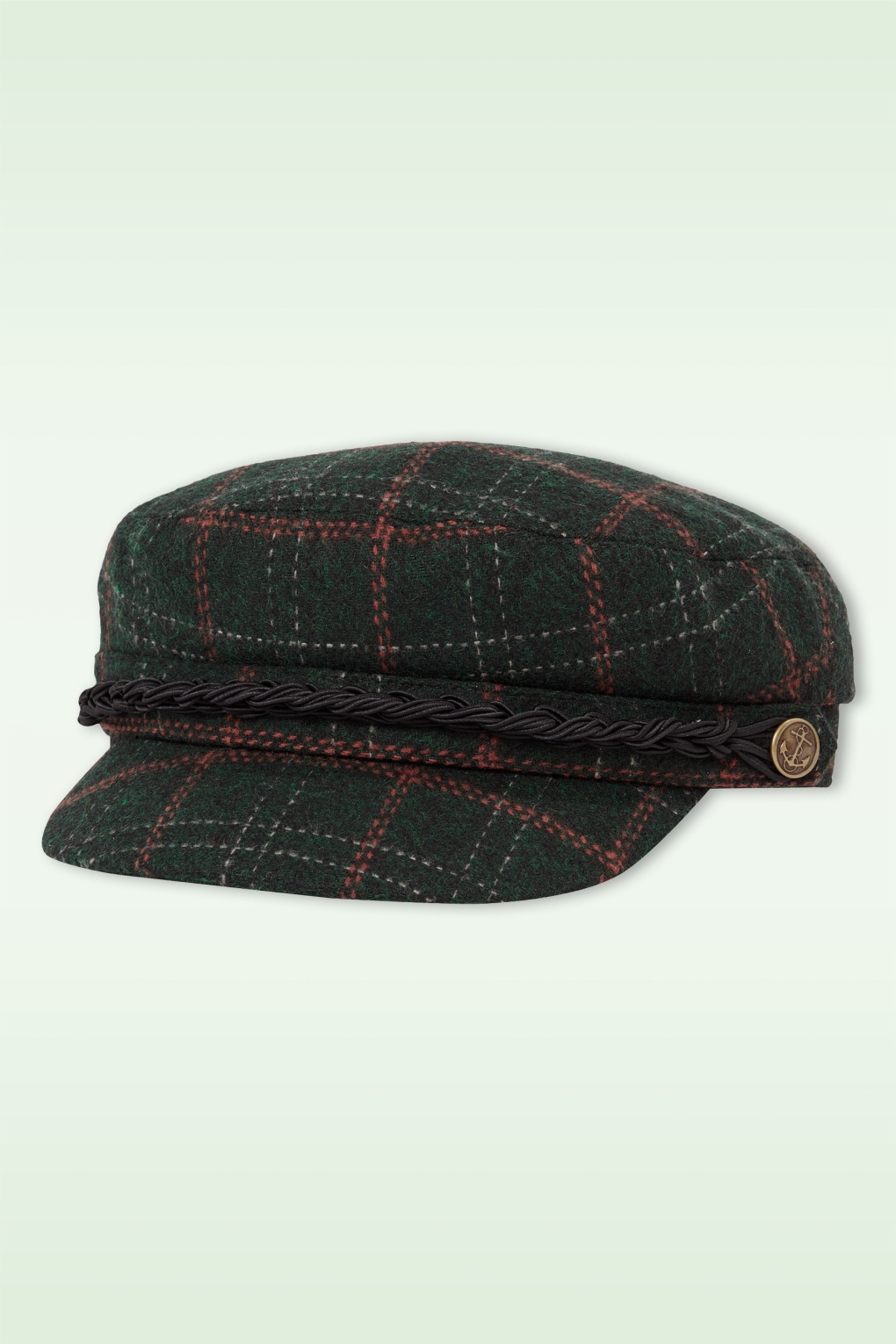”Ahoy sailor!” Deze tijdloze schipperspet is uitgevoerd in een luxe en warme, donkergroene geruite stofmix met wol en afgewerkt met een riempje voorzien van een gevlochten koord en knoop detail boven de cap. * Sailor cap * Geheel gevoerd * Verstevigde cap (afneembaar riempje met een gevlochten koord en knoop detail)