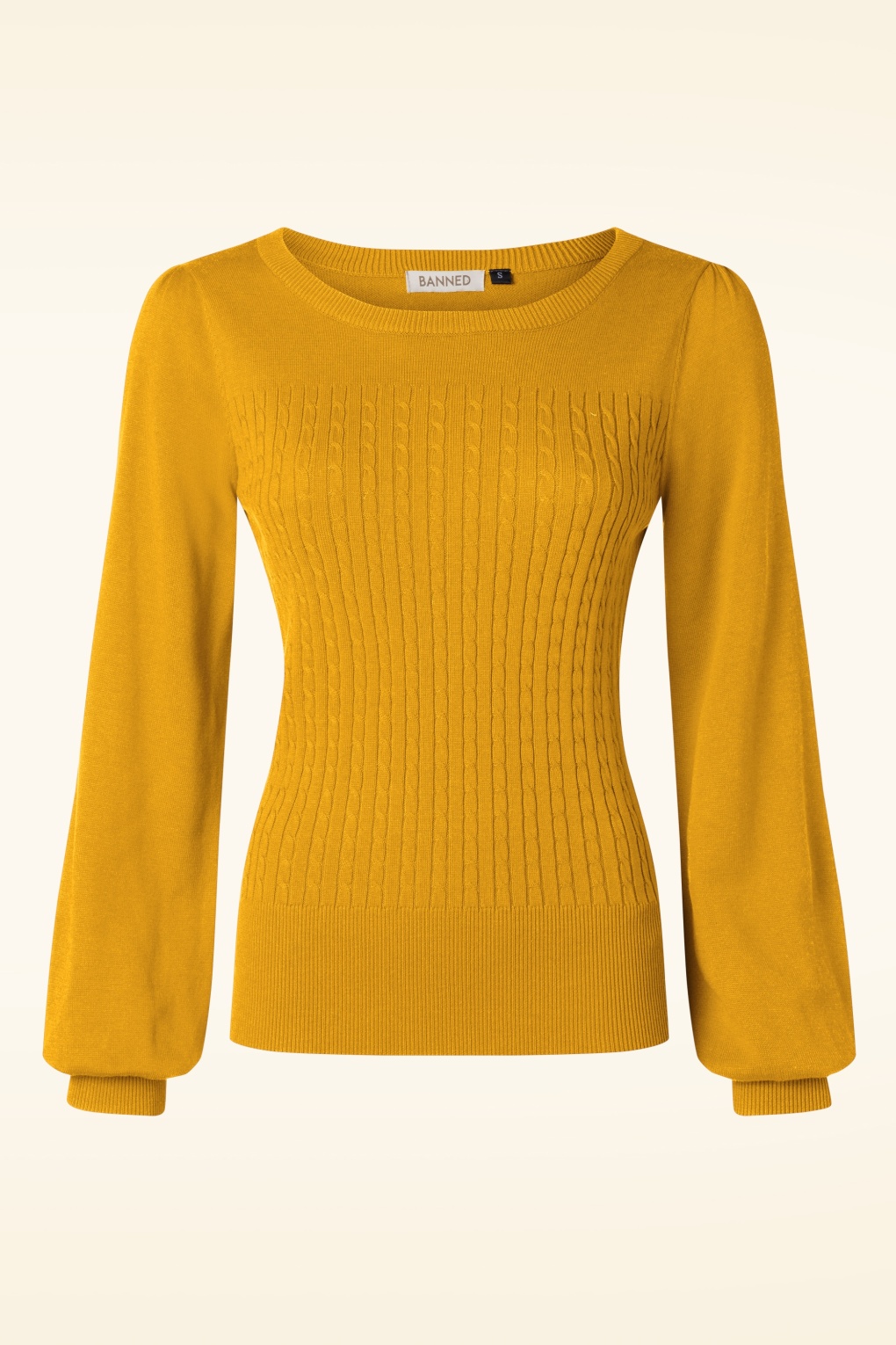 ”Bring on the colder days!” Deze jumper is uitgevoerd in een heerlijke soepele, stretchy, mosterdgele viscose-/ katoenmix met een klassiek kabelpatroon. * Lange pofmouwen * Stretchy ribboord * Lang genoeg om op een normale heupbroek te dragen