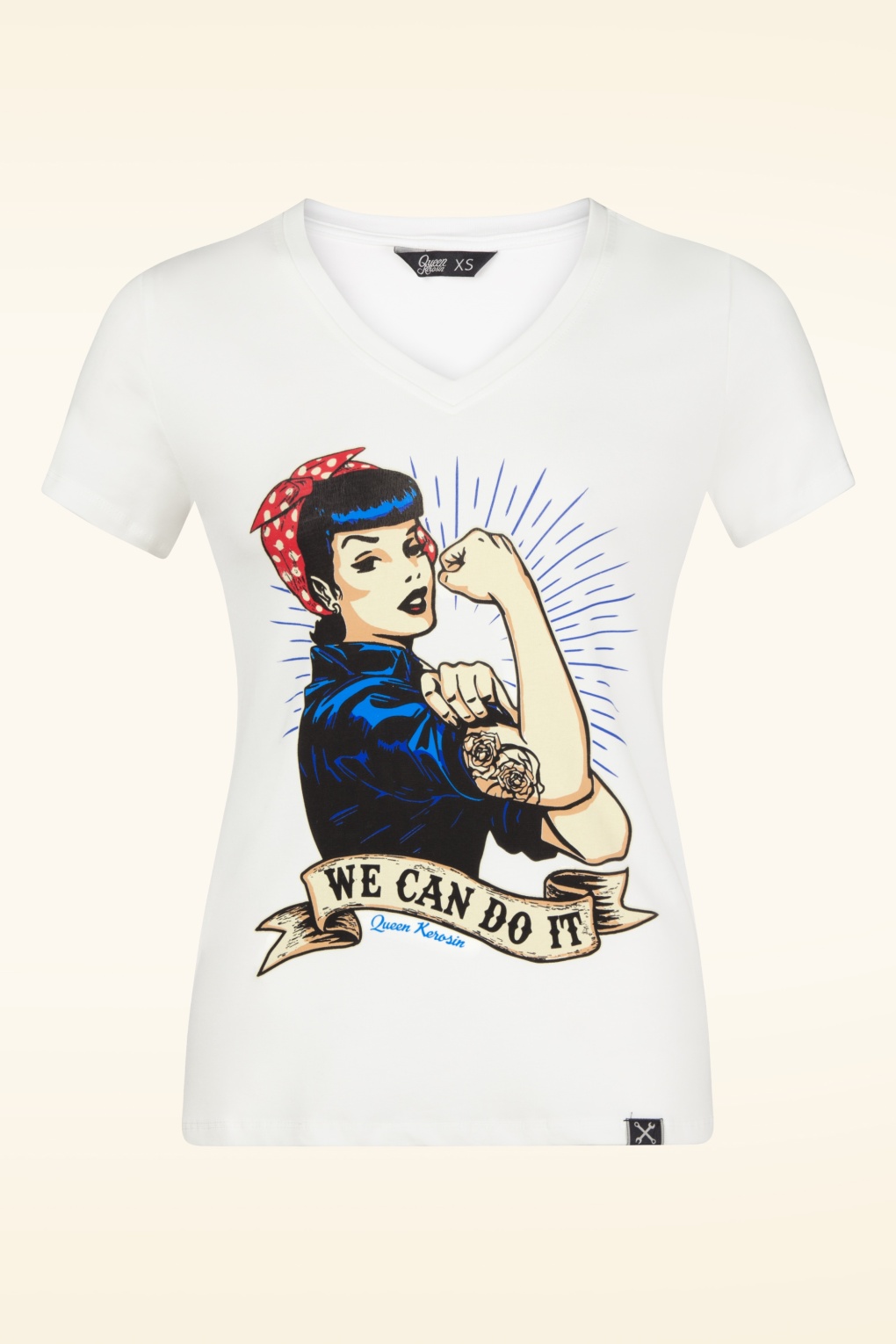 Dit We Can Do It T-Shirt in gebroken wit hoort gewoon jouw kledingkast te rocken! Want zeg nou zelf; T-shirts kun je toch nooit genoeg hebben. Een speelse V-halslijn, korte mouwen en een TE leuke print van een stoere chick maken dit shirt een echte must-have. Uitgevoerd in een heerlijk zachte en stretchy katoenmix in gebroken wit die een genot is om te dragen. Je kunt vast nog wel één shirtje aan je collectie toevoegen, toch? 😉 * V-halslijn * Korte mouwen * Lang genoeg om op een normale heupbroek te dragen