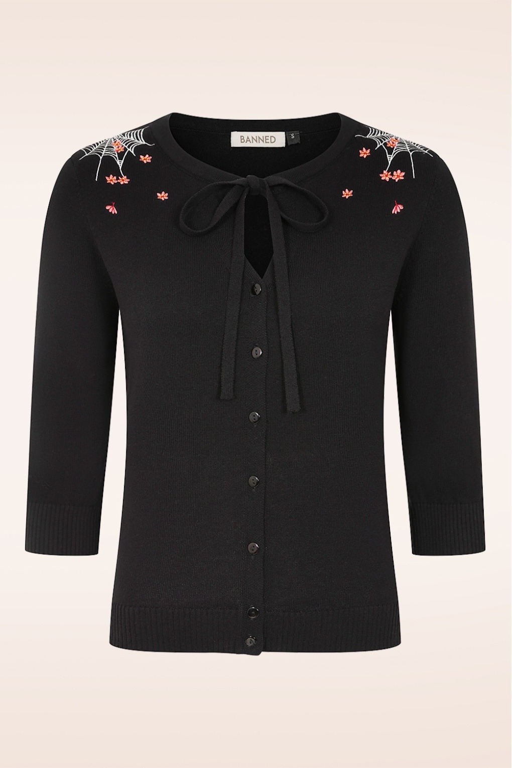 “A cardigan caught in its own web.” Uitgevoerd in een stretchy, fijngebreide, zwarte katoen voorzien van geborduurde spinnenwebben en herfstachtige bloemetjes die heerlijk draagt. * 3/4 mouwen * Vast strikdetail aan de halslijn * Knopenrij * Stretchy ribboorden * Lang genoeg om op een normale heupbroek te dragen * Let op; de kleur van het product op de video kan afwijken van de daadwerkelijke kleur van het product